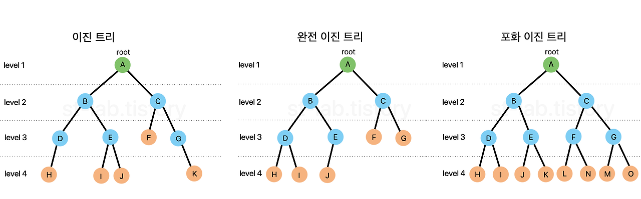 단말 노드(leaf node) : 리프 노드라고도 불리며 자식 노드가 없는 노드를 의미한다. (이미지에서 H, I, E, F, G)