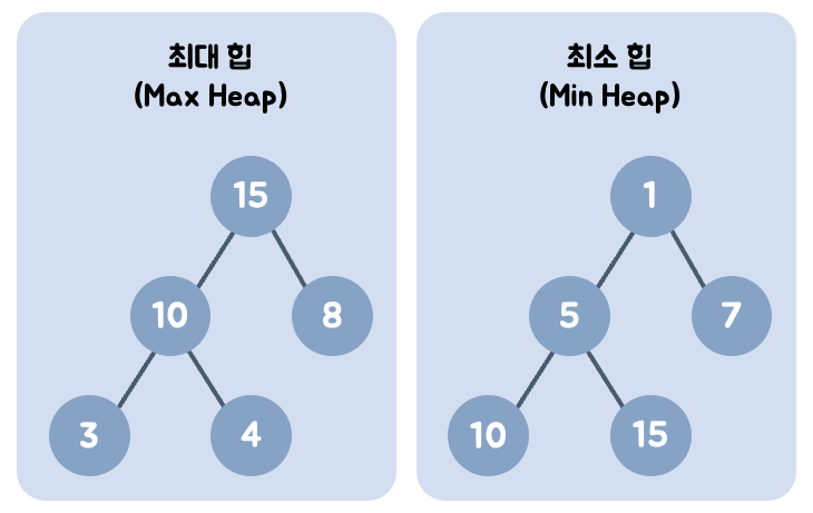 Heap (힙) : 최솟값 또는 최댓값을 빠르게 찾아내기 위해 완전 이진 트리 형태로 만들어진 자료구조