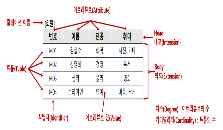 | 참조 무결성 (Referentail Integrity) | 엔터티의 외래 식별자 속성은 참조하는 엔터티의 주 식별자 값에 포함되거나 NULL이어야 함을 의미 |