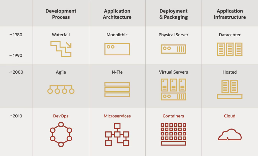 1990년대 aisle 개발 방법론, 아키텍처는 N-계층으로 발전해 모듈화된 구조, 가상서버 기술이 등장해 배포와 패키징에 변화를 가져왔다.