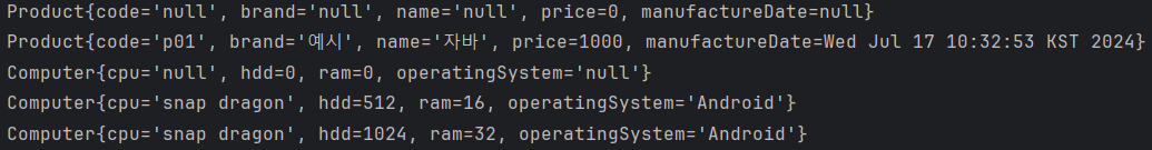 Product{code='s-1234', brand='Google', name='픽셀', price=1000000, manufactureDate=Wed Jul 17 10:39:34 KST 2024}Computer{cpu='snap dragon', hdd=1024, ram=32, operatingSystem='Android'}