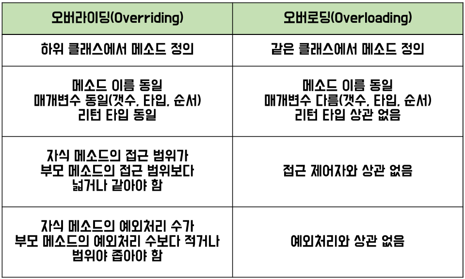 오버라이딩은 말그대로 매개변수, 메소드명 그대로 두고 자식클래스에서 다시 정의하는 것이고,