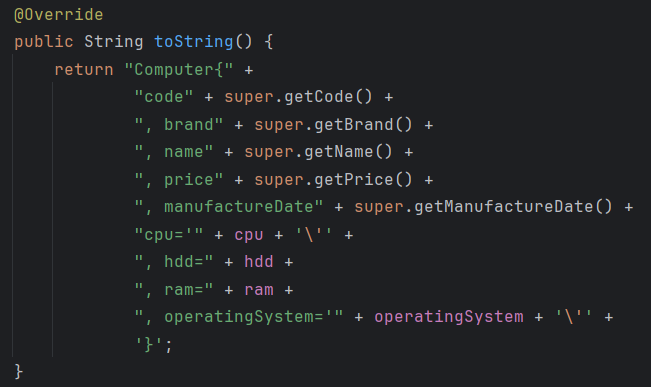 computer2 는 부모의 생성자들도 받아온 객체여서 code, brand, name, price, manufatureDate가 더 필요한데 toString()에서 더 나와야 하니 수정해준다.