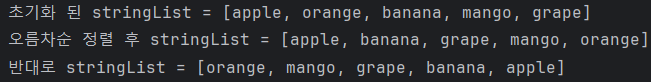 System.out.println("오름차순 정렬 후 stringList = " + stringList);