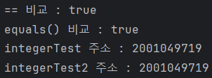 System.out.println("equals() 비교 : " + integerTest.equals(integerTest2));