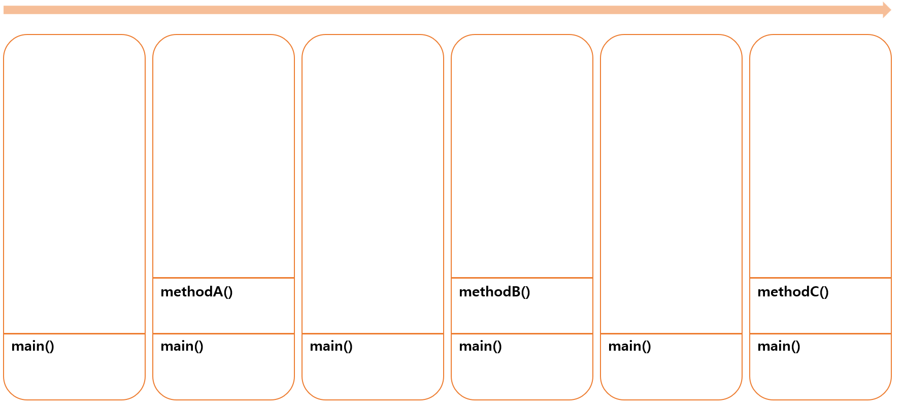 A가 B호출, B가 C호출 -> C 종료된 후 다시 B로 돌아오고 B 종료 -> A 종료 -> main() 종료