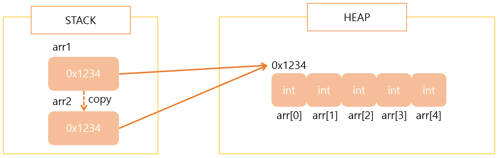 즉, 2개의 레퍼런스 변수는 동일한 배열의 주소값을 가지고 있게 돼 하나의 변수에서 배열의 값을 수정하게 되면 다른 변수에서도 같이 변경된다.