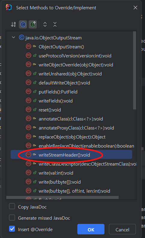 OutputStream클래스에서writeStreamHeader메소드 때문에 객체를 새로 추가해주면 헤더가 계속 들어오려고 하는데, 파일에는 하나의 헤더만 필요하다.