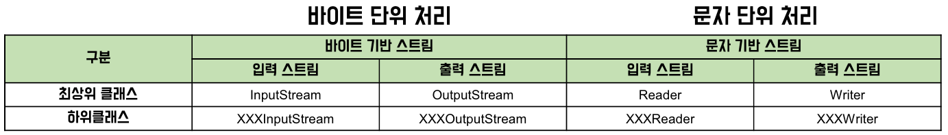 바이트 단위 처리와 문자 단위 처리를 위한 스트림 등이 존재한다.
