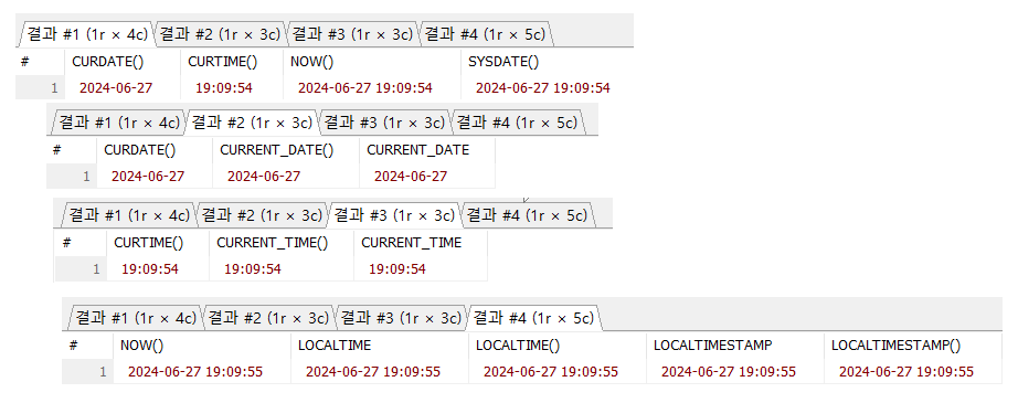 -- NOW(), LOCALTIME, LOCALTIME(), LOCALTIMESTAMP, LOCALTIMESTAMP()는 동일