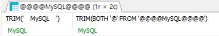 SELECT TRIM(' MySQL '), TRIM(BOTH '@' FROM '@@@@MySQL@@@@');
