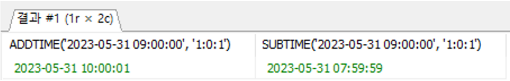SELECT ADDTIME('2023-05-31 09:00:00', '1:0:1'), SUBTIME('2023-05-31 09:00:00', '1:0:1');