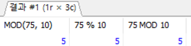 SELECT MOD(75, 10), 75 % 10, 75 MOD 10;