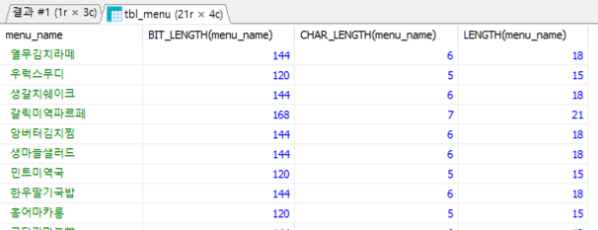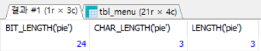 SELECT menu_name, BIT_LENGTH(menu_name), CHAR_LENGTH(menu_name), LENGTH(menu_name) from tbl_menu;