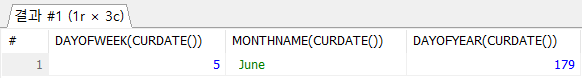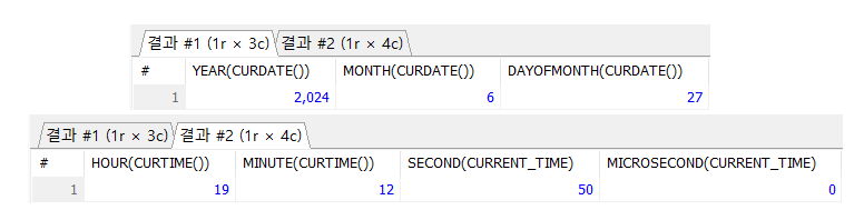 HOUR(시간), MINUTE(시간), SECOND(시간), MICROSECOND(시간) : 날짜 또는 시간에서 연, 월, 일, 시, 분, 초, 밀리초를 추출