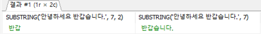 SELECT SUBSTRING('안녕하세요 반갑습니다.', 7, 2), SUBSTRING('안녕하세요 반갑습니다.', 7);