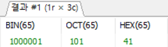 SELECT CONV('A', 16, 10), CONV('A', 16, 2), CONV(1010, 2, 8);