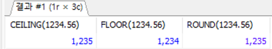 SELECT CEILING(1234.56), FLOOR(1234.56), ROUND(1234.56);