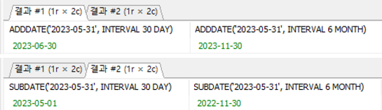 SELECT ADDDATE('2023-05-31', INTERVAL 30 DAY), ADDDATE('2023-05-31', INTERVAL 6 MONTH);