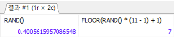 1부터 10까지 난수 발생: FLOOR(RAND() * (11 - 1) + 1)