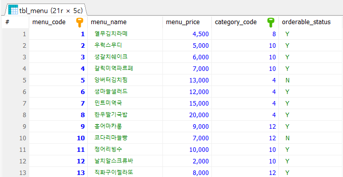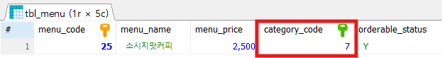 INSERT INTO tbl_menu ( menu_name , menu_price , category_code , orderable_status )이 부분에서 컬럼을 SKIP 해도 되지만 value에서 null 값인지 아닌지 다 적어줘야 하고, 실무에서도 유지보수 측면에서 적어주는 것이 좋다.