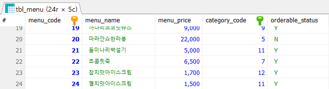 사진에 25개 행이 있던 테이블 중 소시지맛커피를 지워서 24개로 줄어들었다.