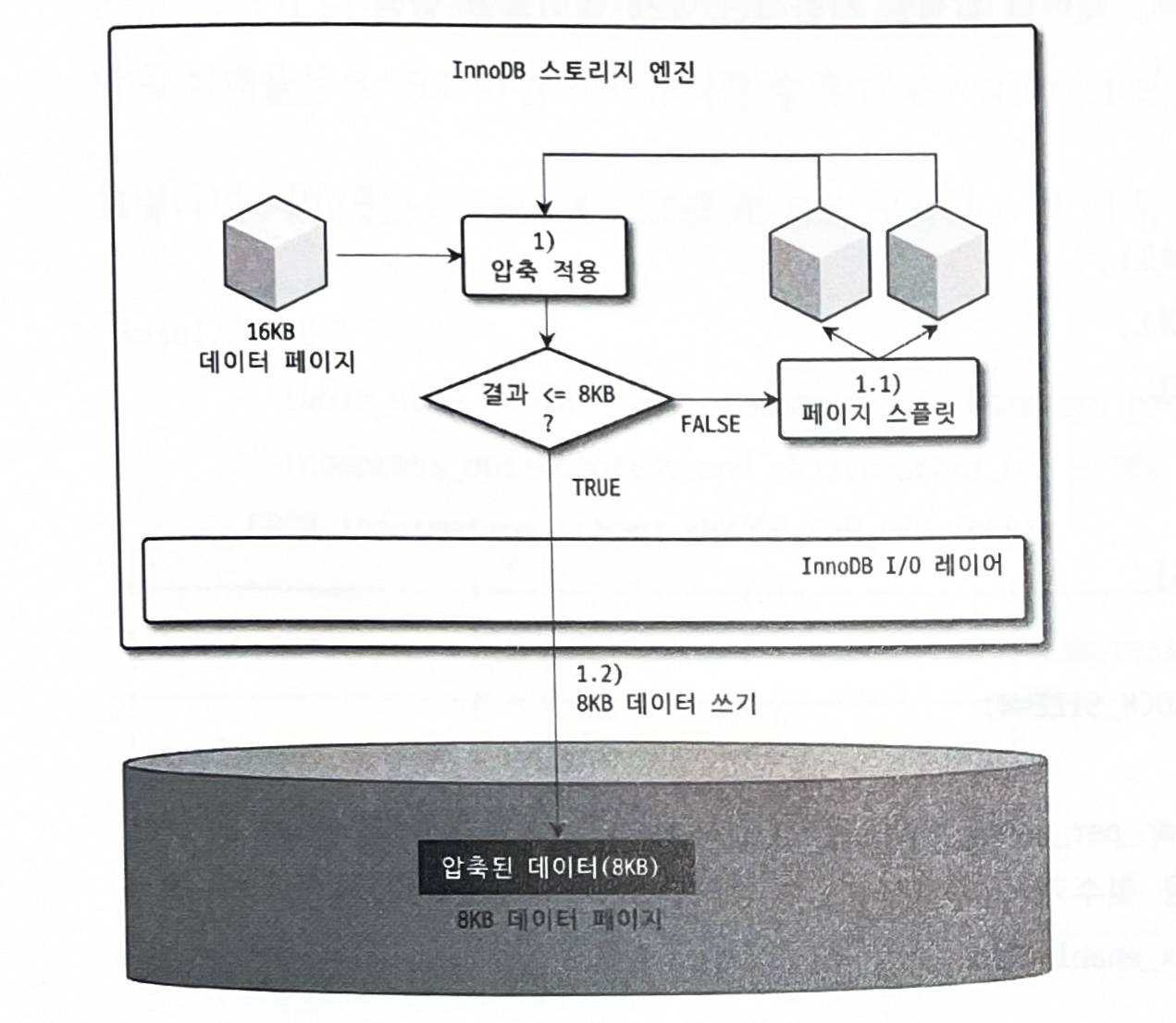 테이블 압축 방식에서 가장 중요한 것은 원본 데이터 페이지의 압축 결과가 목표 크기(KEY_BLOCK_SIZE)보다 작거나 같을 때까지 반복해서 페이지를 스플릿하는 것이다.