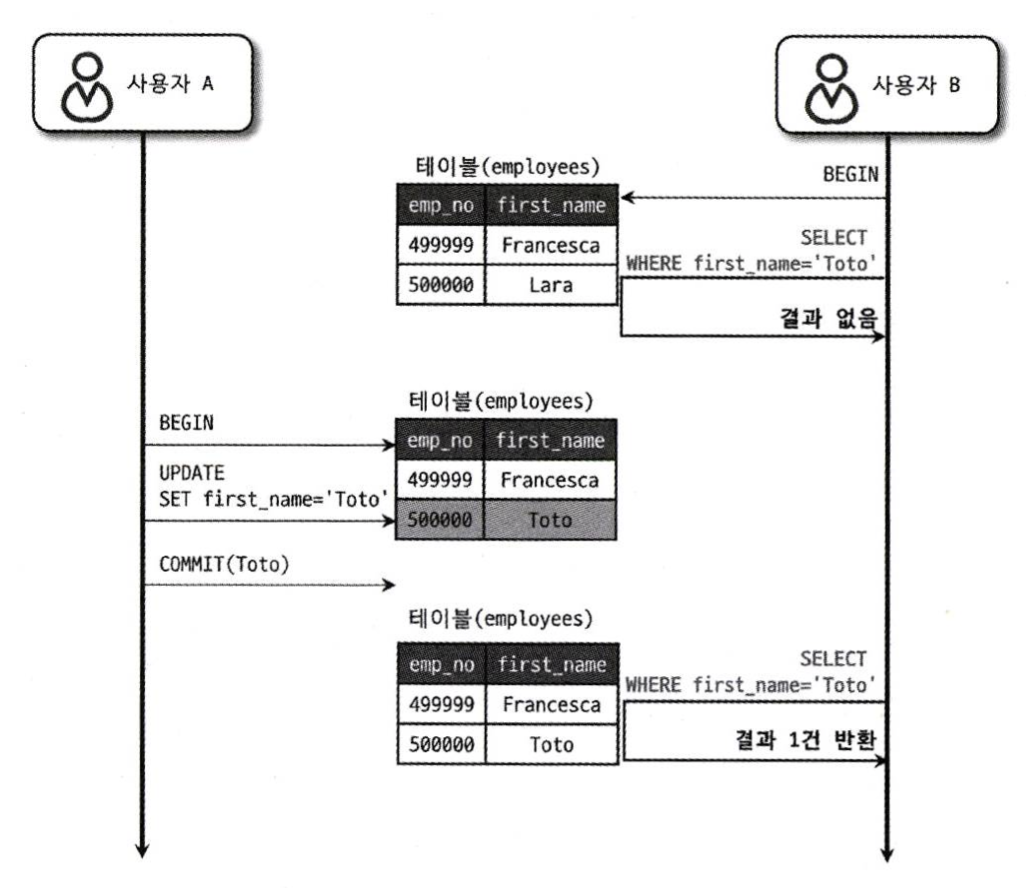 사용자 B는 BEGIN 명령으로 트랜잭션을 시작한 후 SELECT을 수행하기 때문에 두 번의 SELECT 쿼리 결과는 똑같아야 한다.
