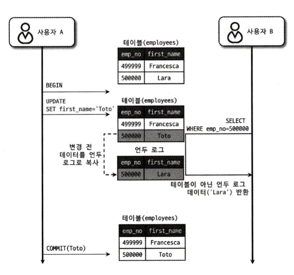사용자 A가 데이터를 변경한 후, 사용자 B가 해당 컬럼을 조회하면 언두 로그에 백업된 레코드를 조회하게 된다.