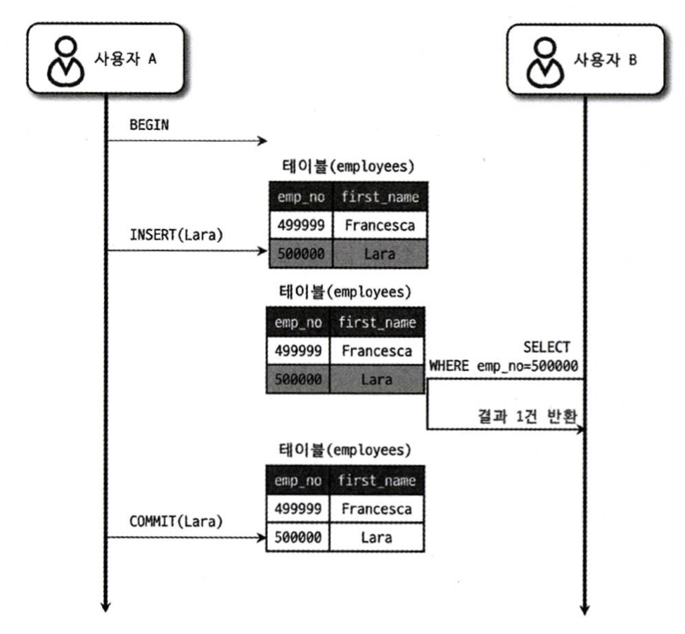 여기서 문제는 사용자 A가 처리 도중 알 수 없는 문제가 발생해 INSERT된 내용을 롤백한다고 하더라도 사용자 B는 “Lara”가 정상적인 사원이라고 생각하고 계속 처리할 것이라는 점이다.