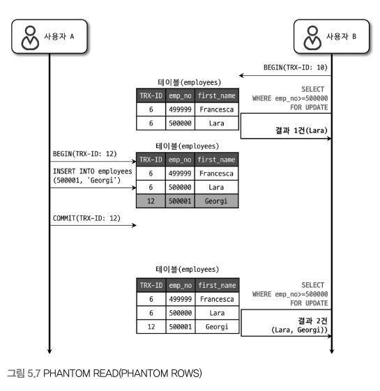 다른 트랜잭션에서 수행한 변경 작업에 의해 레코드가 보였다 안 보였다 하는 현상을 팬텀 리드(PHANTOM READ)라고 한다.