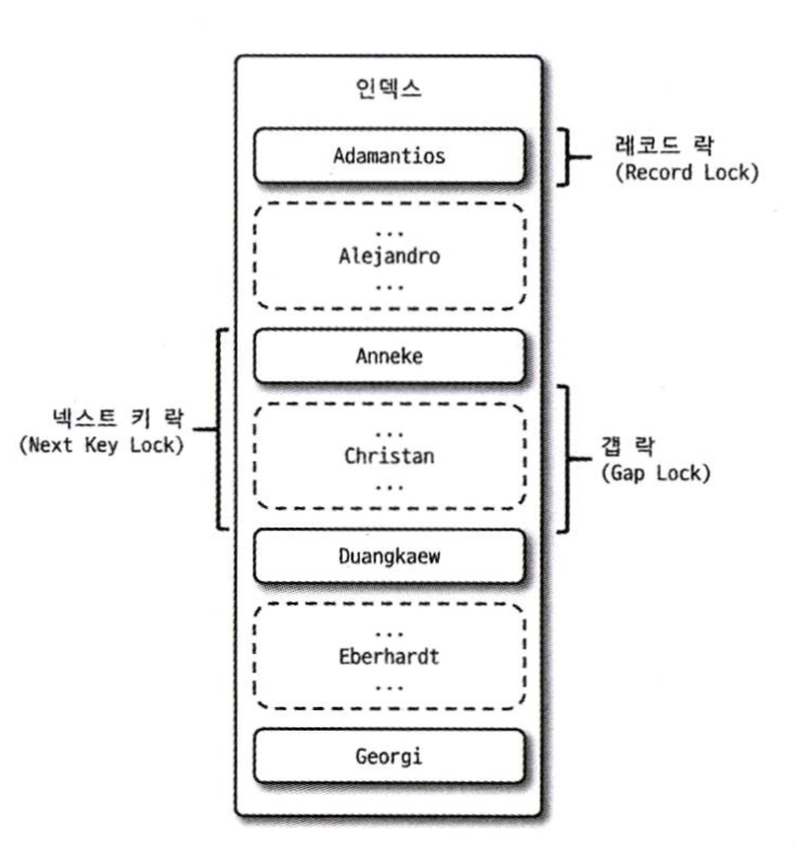 MySQL에서 제공하는 잠금과는 별개로 스토리지 엔진 내부에서 레코드 기반의 잠금 방식을 탑재하고 있다.