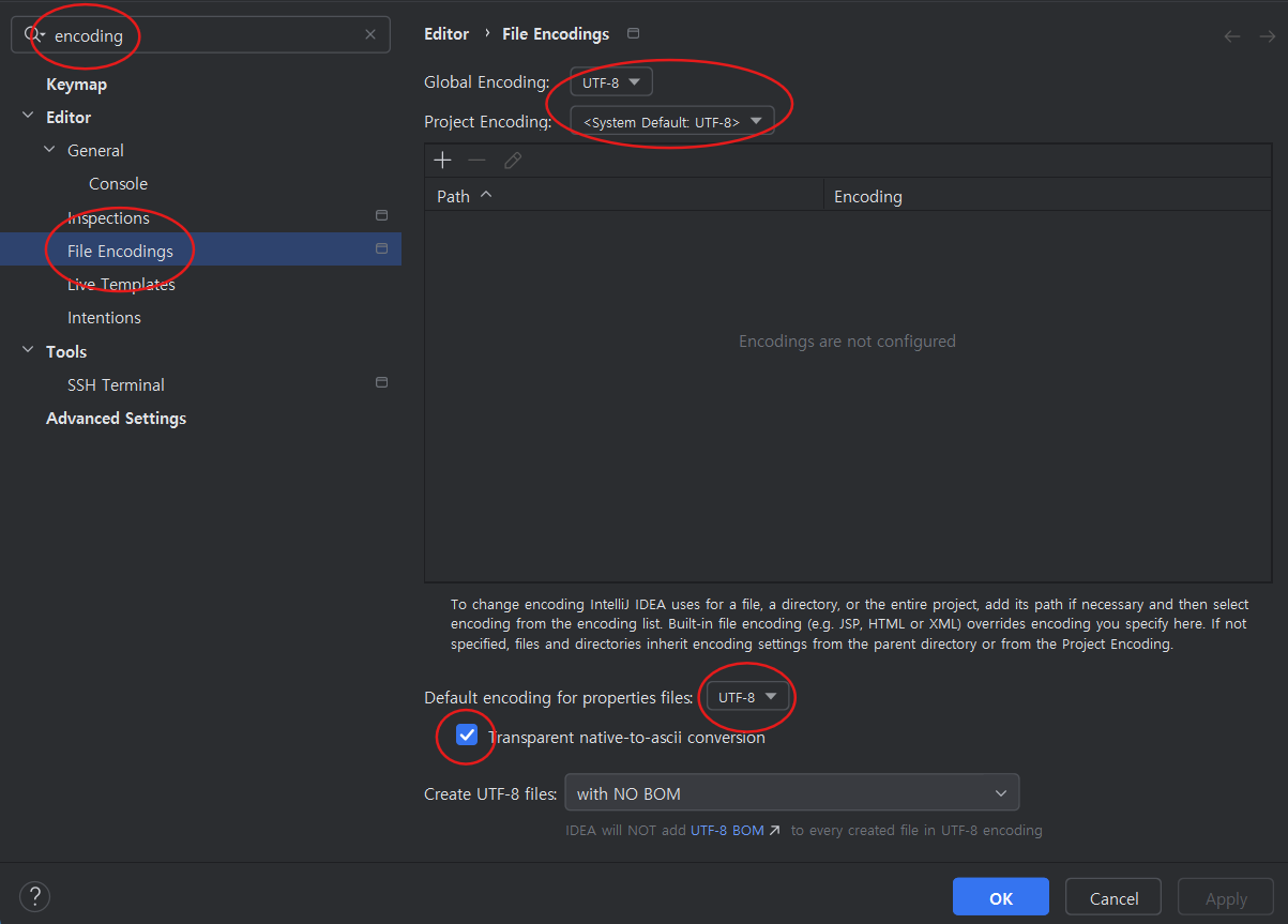 만약 한글이 깨진다면 ctrl + alt + s 로 setting에 들어가서