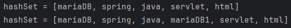 System.out.println("hashSet = " + hashSet); // hashSet = [mariaDB, spring, java, mariaDB1, servlet, html]