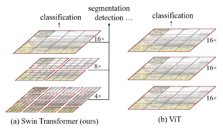 이미지를 작은 단위에서 attention을 적용시키고 점점 merge해서 큰 단위를 읽어서 attention을 적용시키는 방식이다.