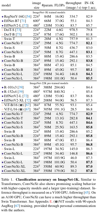 ConvNext 모델은 Convnet의 simple함을 유지하면서 transformer에 비해서 정확도와 scalability에서 더 우수한 성능을 보였다.
