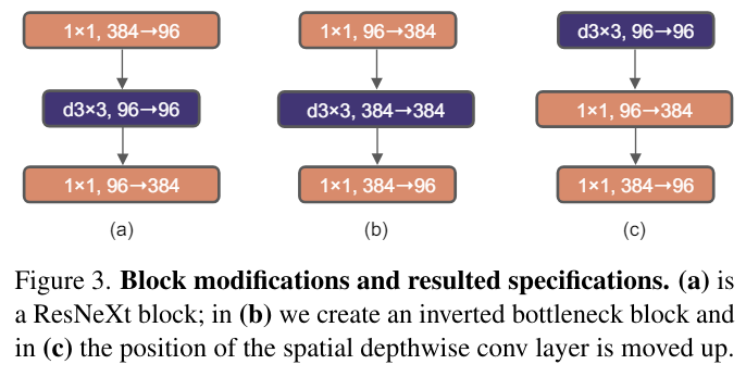 여기 주어진 이미지에서 (a)는 ResNeXt를 적용한 block이고 (b)는 inverted bottleneck으로 내부에서 커지는 느낌으로 진행이 된다.