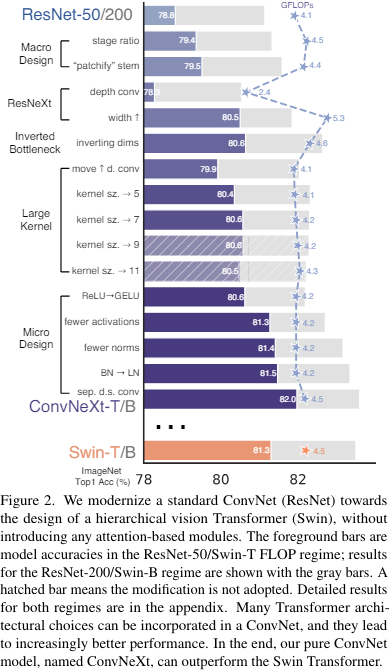 현재 vision 분야는 (계층적) transformer가 지배를 하고 있는데 사실 transformer는 CNN과 비슷한 구조로 바뀌어가고 있다. 여기에서 왜 transformer가 성능이 잘 나오는지 CNN을 점차 transformer와 비슷한 구조로 바꾸어 가면서 성능에 영향을 미치는 요소를 알아내고 순수한 CNN의 한계를 테스트 해보겠다는 내용이다.