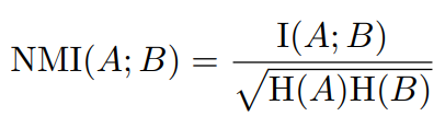 A와 B의 두가지 다른 assignment에서 공유되는 정보를 비교하기 위해서 Normalized Mutual Information(NMI)를 사용