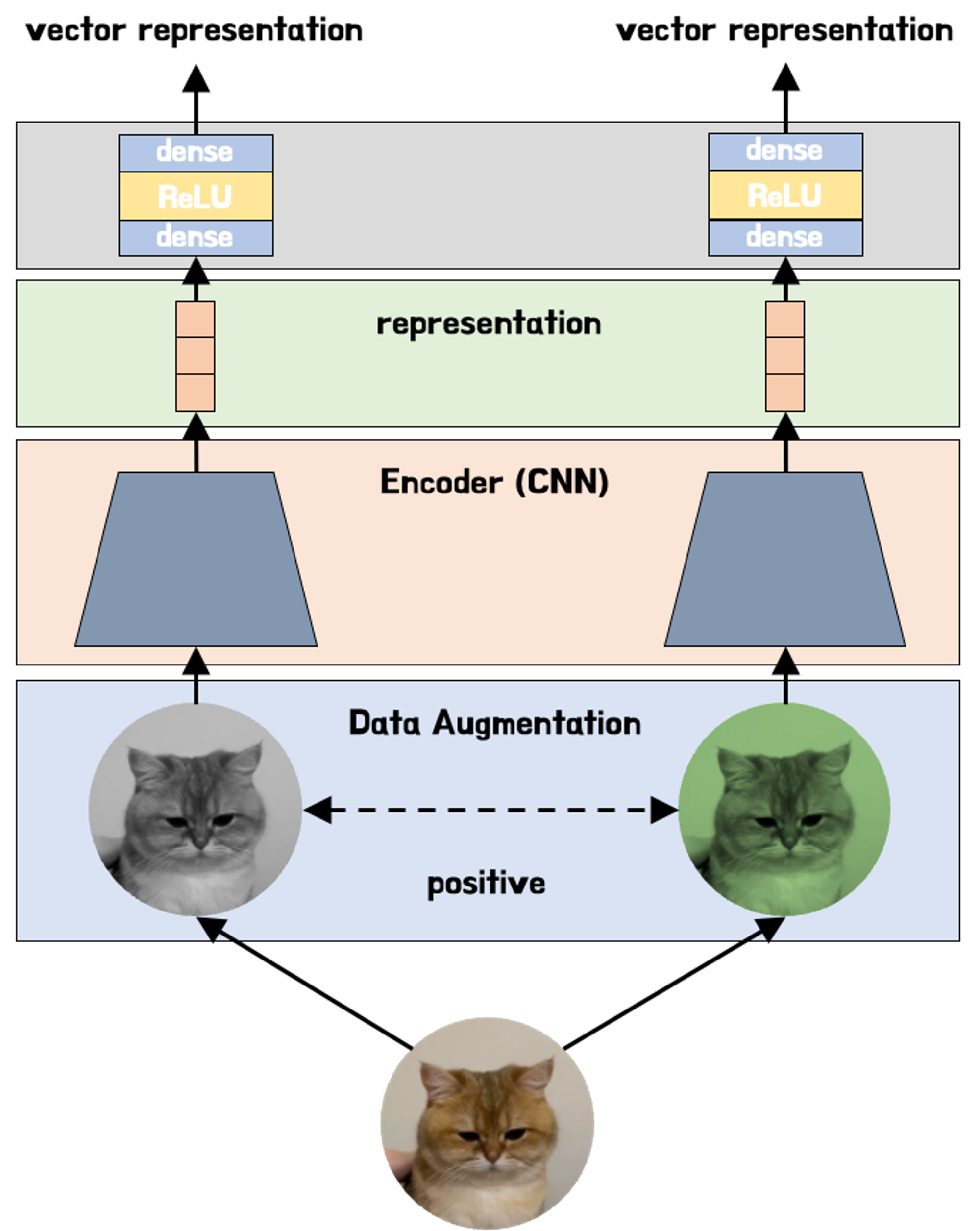 이런 식으로 기존의 데이터를 색을 바꾸거나 돌리거나 자르는 등 변경을 가하고 원본과 동일한 벡터 표현을 할 수 있도록 vecotr 차이를 줄이는 방향으로 학습하는 것이다.