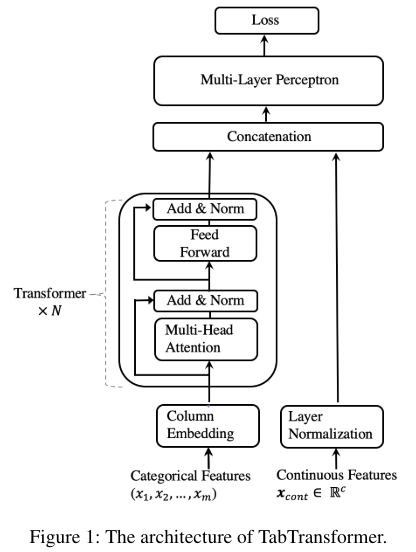 TabTransformer는 N개의 transformer과 MLP로 구성되어있다.