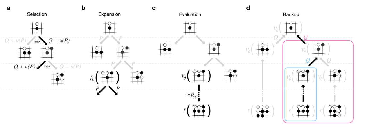 간단하게 몬테카를로 트리 서치(MCTS)를 통해서 사람처럼 스스로 미래의 수를 계속 둬보는 것이 중심이다.