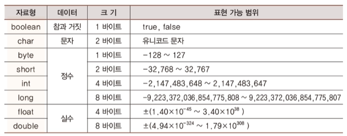 (Primitive Data Type)κΈ°λ³Έ μλ£νμ λ€μκ³Ό κ°μ΄ λ°μ΄ν°μ μ’ λ₯μ λ°λΌ ν¬κ² λ€κ°μ§( μ°Έκ³Ό κ±°μ§ / λ¬Έμ / μ μ / μ€μ )λ‘ κ΅¬λΆλλ€.
