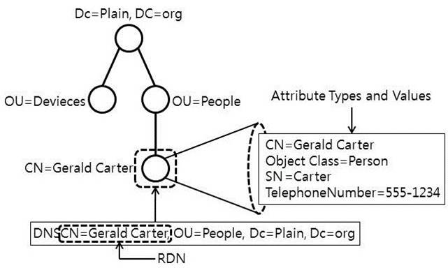 Entry : Directory에서 정보를 표현하는 기본 단위. 다수의 Attribute로 이루어져 있다. 각각의 Entry에는 DN(Distinguish Name)으로 구분되고 DIT(Directory Information Tree) 구조로 형성된다.