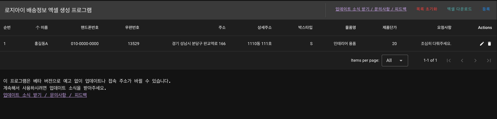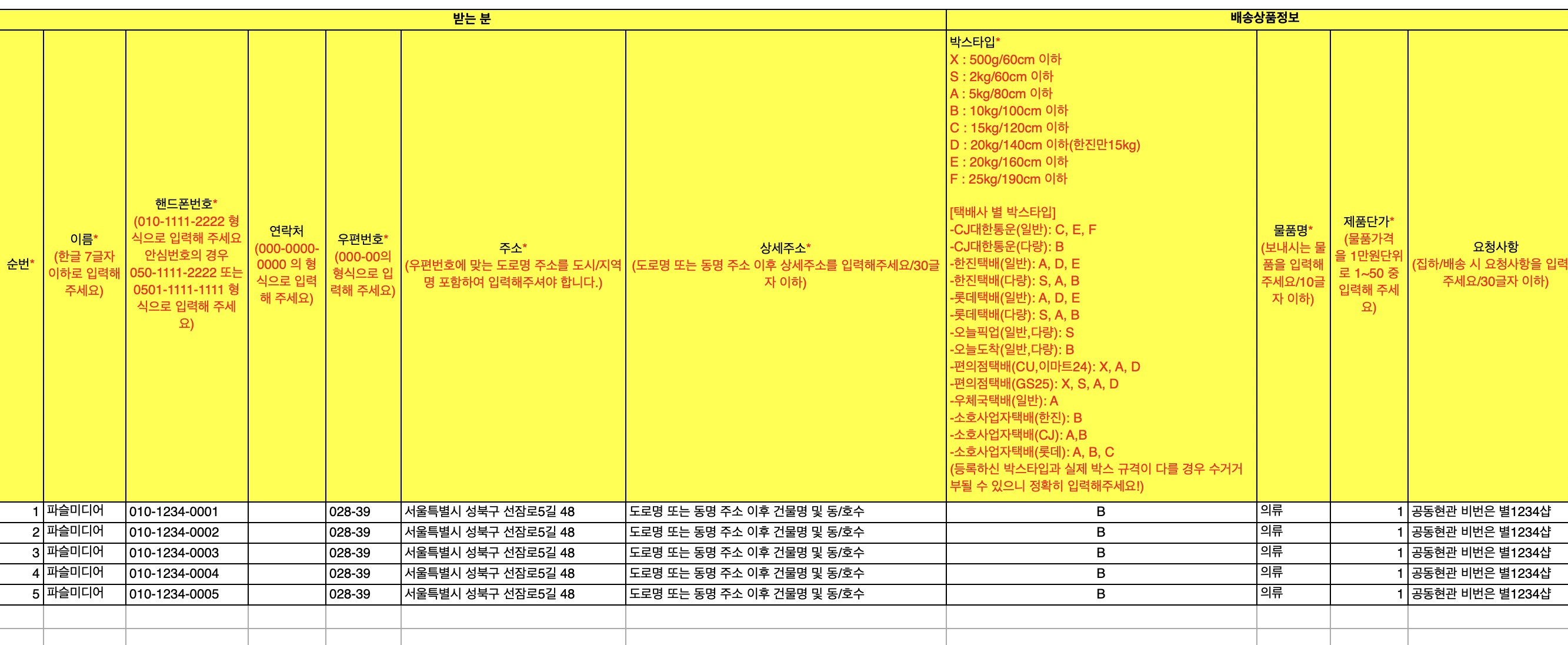 위와 같은 양식으로 엑셀을 만들어야하는데, 우편번호와 도로명 주소를 모두 따로 검색을 해야하고, 글자 수나 핸드폰 번호 양식, 택배사 별 배송가능한 박스타입 등등 유효성을 놓치면 다시 엑셀을 만들어야 하는게 너무 힘들었어요.