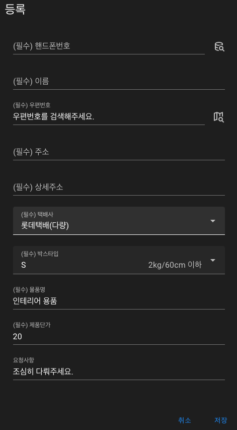 그외에 한 번 배송을 보냈던 사람의 정보는 핸드폰 번호를 unique pk 로 둬서 이전 정보를 불러와서 넣을 수 있게 해서 작성 시간을 줄일 수 있게 했고요.