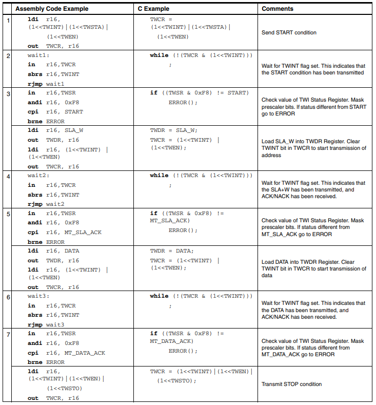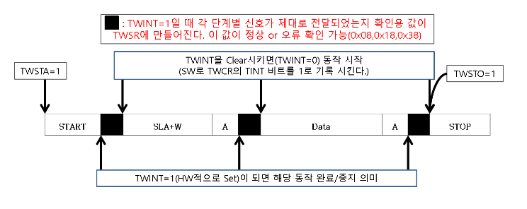 - TWI통신은 인터럽트 기반의 바이트 단위를 전송하며, 바이트 단위로 송수신 될 때마다 TWINT가 High가 된다. 이를 Clear하게되면 동작을 시작한다.