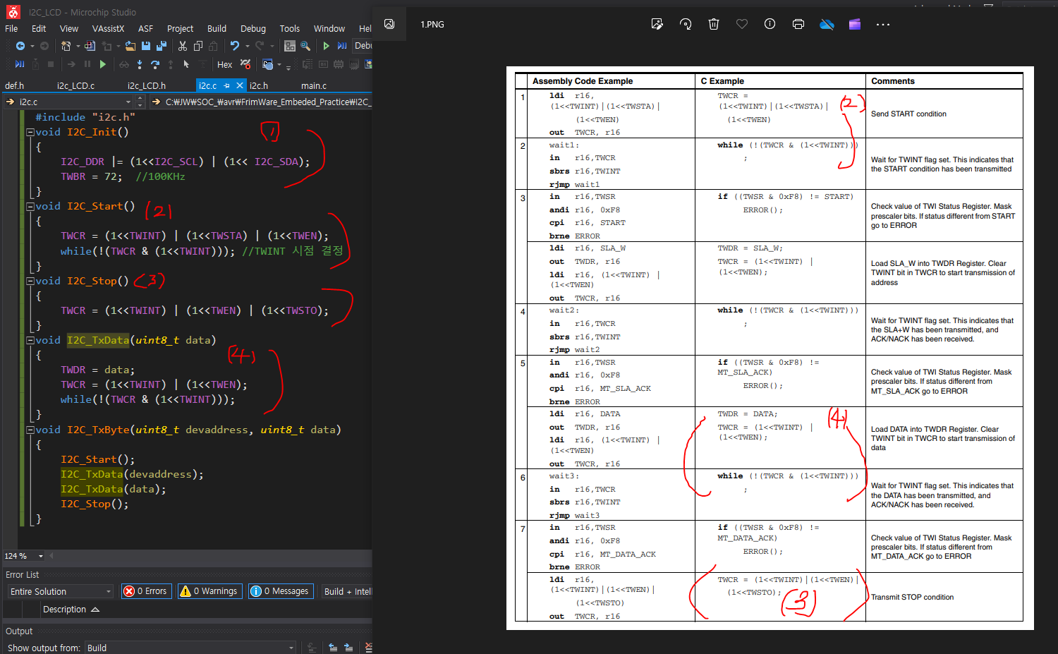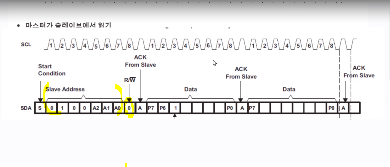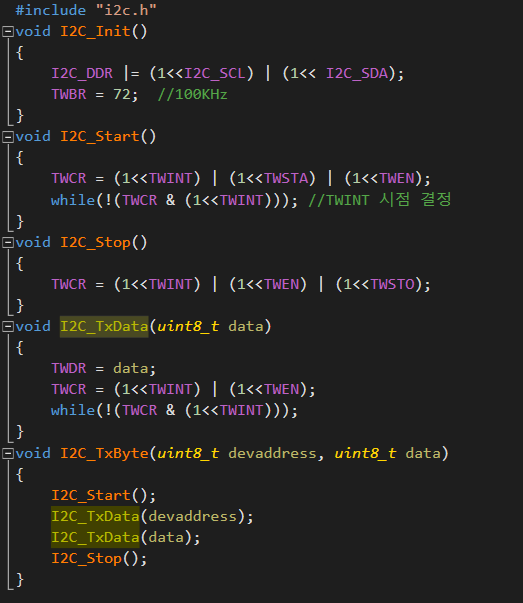 - 코드내용을 간단히 정리를 해보자면 I2C통신을 시작 할 때(Start) TWEN, TWSTA에는 1을 줘서 enable과 start신호를 준다 하지만 TWINT는 특수 레지스터이다. 간단하게 말하자면 처음에 1 (High)로 세팅을 해준다는 의미는 다음 동작을 실행하 준비가 완료되었다는 의미입니다. 이를 while문안에서 확인하는 이유는 다음 동작을 실행시킨다는 의미이며 만약 TWINT가 0이 되면 다음 동작을 실행합니다.