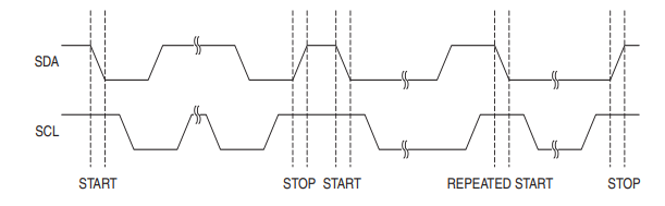 - I2C 통신의 전체적인 통신 타이밍도.(Start와 Stop신호 사이에 데이터와 주소 값을 송수신.)