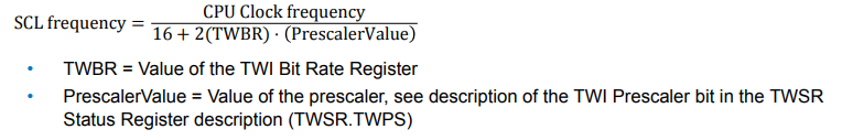 - Bit Rate Generator Unit : 마스터 모드에서 작동할 때 SCL 주기를 제어하며, TWI비트 전송 속도 레지스터(TWBR)의 설정과 TWI 상태 레지스터(TWSR)의 프리스케일러 비트에 의해 제어됩니다. 슬레이브의 CPU클록 주파수는 SCL주파수보다 16배 높아야합니다 따라서 다음 사진의 식을 사용해서 SCL주파수를 결정합니다.